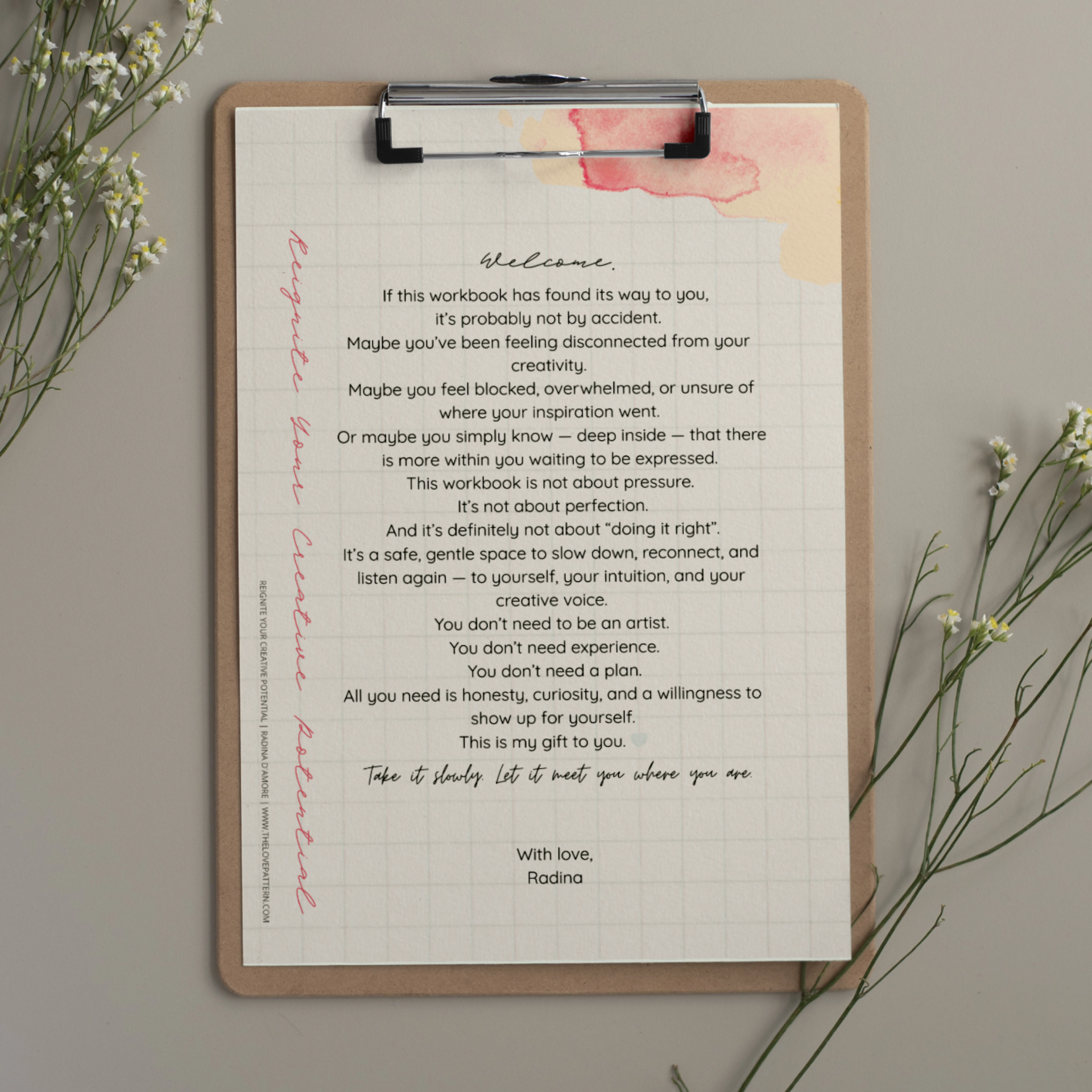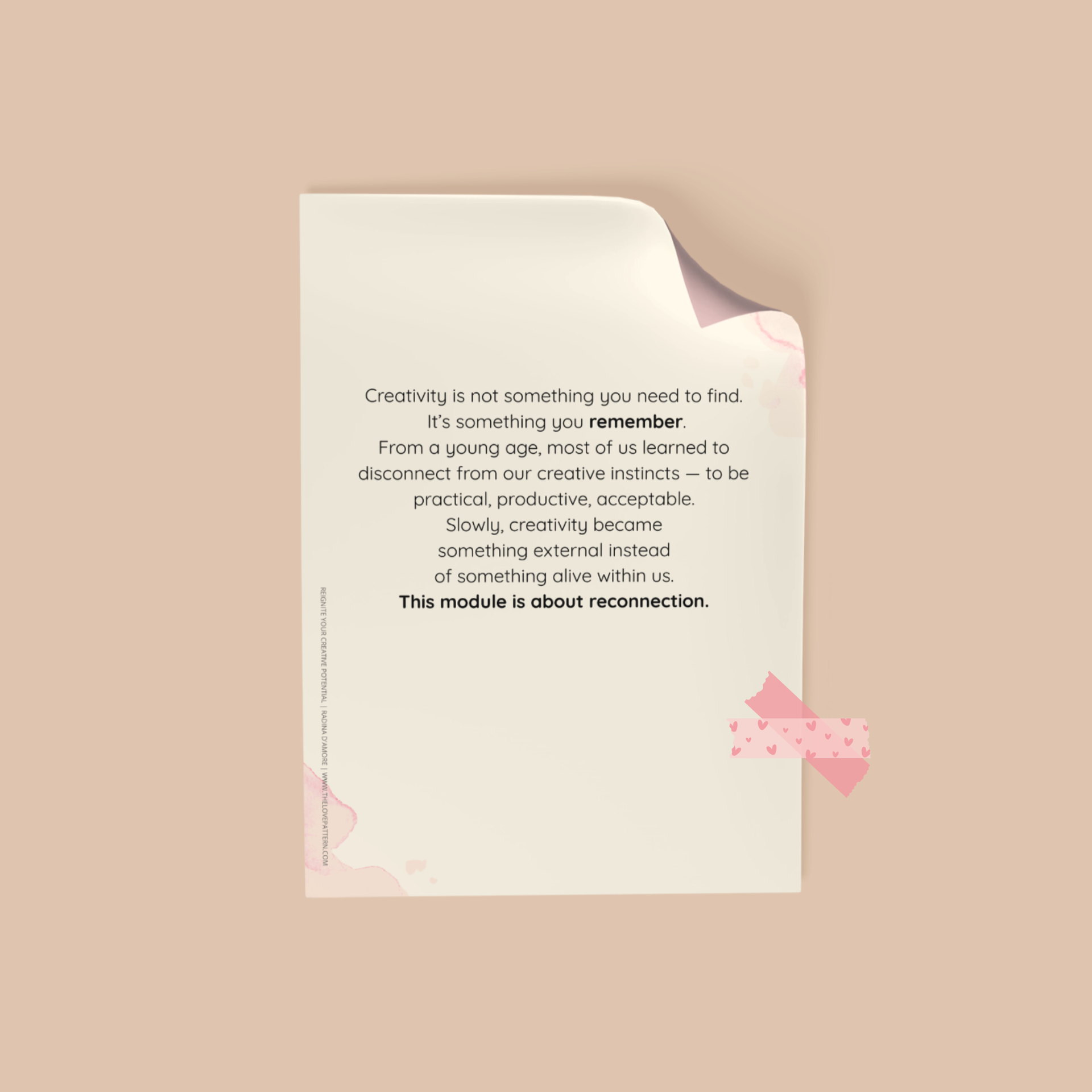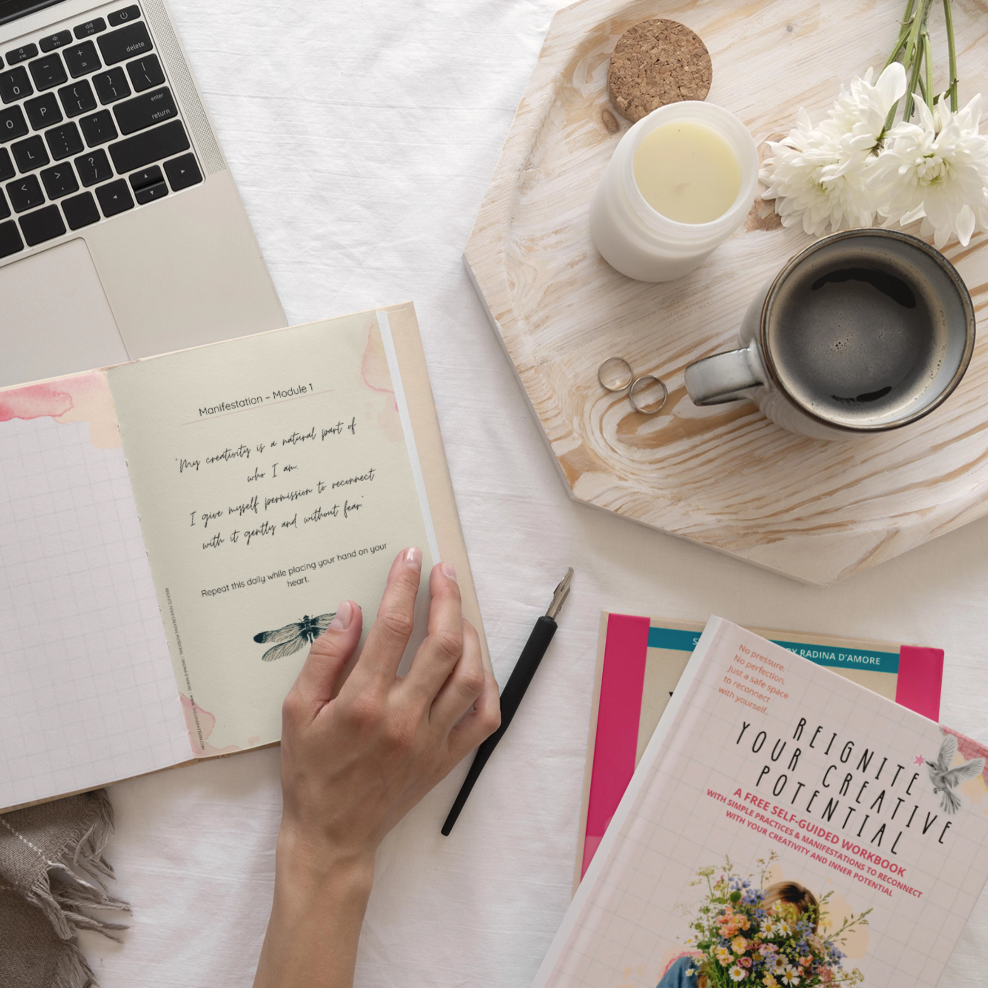 REIGNITE YOUR CREATIVE POTENTIAL is a gentle, soulful workbook created for women and creatives who feel disconnected, blocked, or overwhelmed — yet know there is more inside them waiting to bloom.